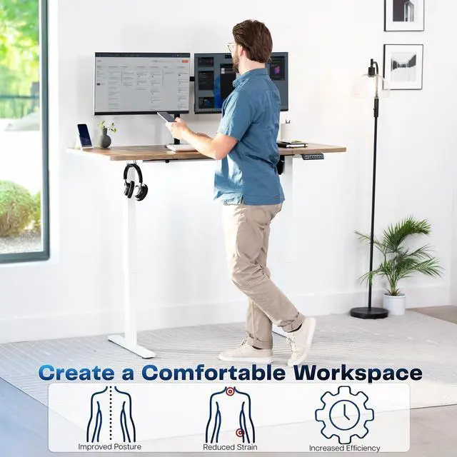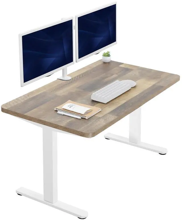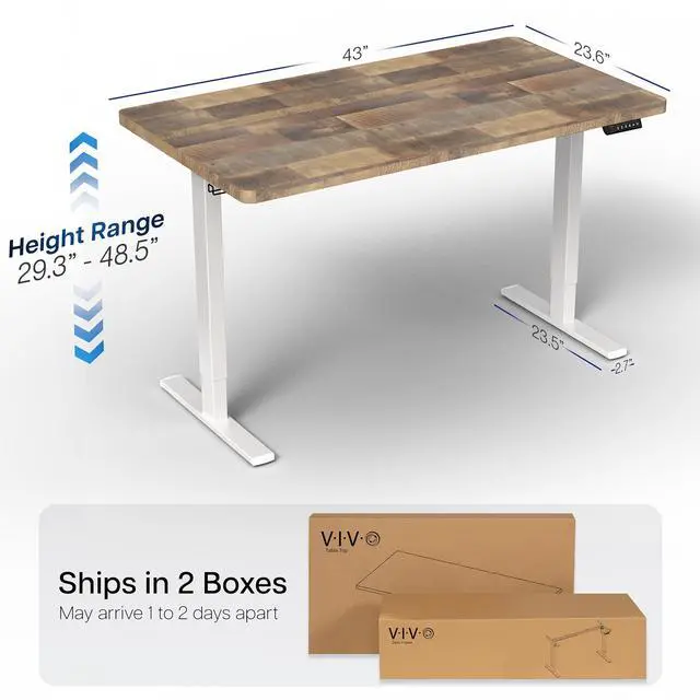 Transform your workstation to accommodate an active work life with the Reclaimed Wood / White 43 x 24 Electric Desk (DESK-KIT-1W4P) from VIVO! Finding a healthy balance between sitting and standing throughout the long work day is made possible with electric height adjustment, telescopic legs, and a simple push-button controller featuring 4 memory presets. The space-efficient table top provides room for dual monitor setups and important supplies so you can organize your workspace to fit your preferred layout. With a frame constructed of solid steel, this desk supports up to 220 lbs and is built to last. Cable management clips keep cords and cables neatly organized and hidden from view for a tidy workspace that encourages concentration. All hardware and instructions are provided, so you can get your new workstation assembled and experience your very own standing desk in no time!