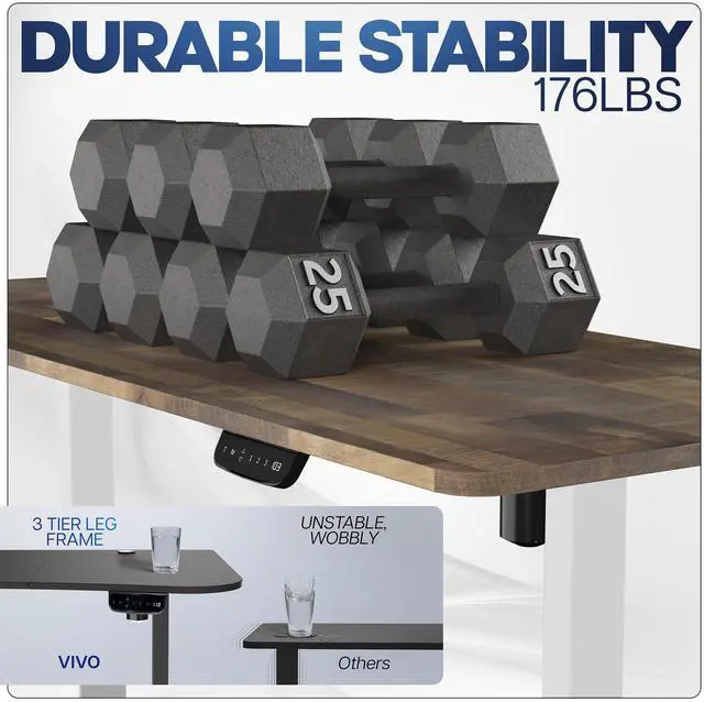 Transform your workstation to accommodate an active work life with the Reclaimed Wood / White 71" x 30" Electric Desk (DESK-KIT-2EW71P) from VIVO! Finding a healthy balance between sitting and standing throughout the long work day is made possible with electric height adjustment, 3-stage telescopic legs, and an elegant touch-screen control panel. The spacious, solid table top provides room for dual-monitor setups and important supplies so you can organize your workspace to fit your preferred layout. With a frame constructed of solid steel, this desk supports up to 176 lbs and is built to last. The integrated cable management system ensures that cords and cables are neatly organized and hidden from view for a tidy workspace. All hardware and instructions are provided, so you can get your new workstation assembled and taking you to new heights!