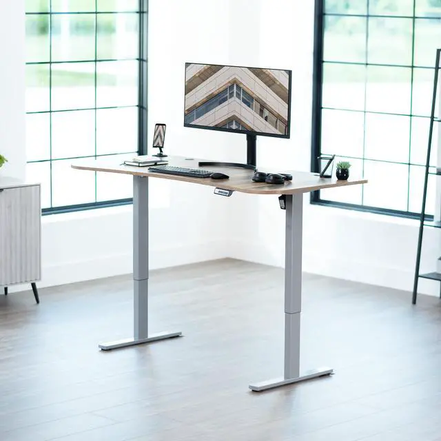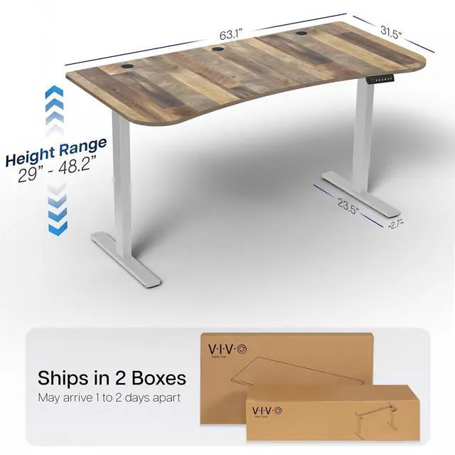 Transform your workstation to accommodate an active work life with the Reclaimed Wood / Gray 63" x 32" Electric Desk (DESK-KIT-1G1P) from VIVO! Find that healthy balance between sitting and standing throughout the long work day with electric height adjustment, telescopic legs, and a simple push-button controller featuring 4 memory presets. With a frame constructed of solid steel, this desk supports up to 220 lbs and is built to last. The table top comes packaged in 3 sections, and all hardware is provided to get your desk frame put together and installed to your desktop in no time!