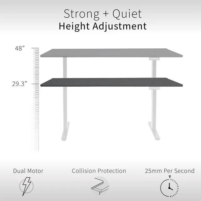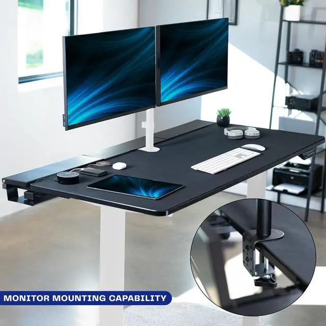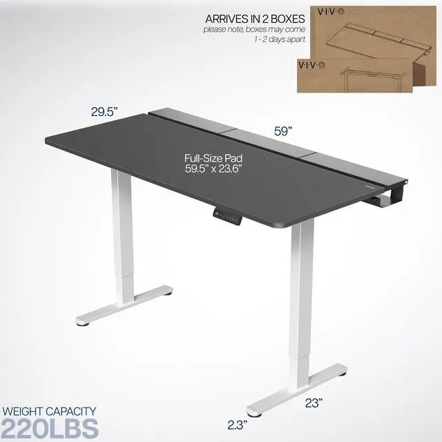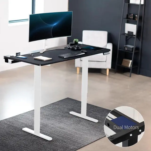 Transform your workstation to accommodate an active work life with the Black / White 60" x 30" Dual Motor Electric Desk with Concealed Cable & Full-Size Pad (DESK-KIT-E2W-P3B) from VIVO! Find that needed balance between sitting and standing throughout the long work day with electric height adjustment, telescopic legs, and a simple push-button controller featuring memory presets. With a frame constructed of solid steel, this desk supports up to 220 lbs and is built to last. The table top features a built-in rear cable management system along with a full-size desk pad for edge-to-edge protection. It comes in 3 sections for easy assembly, and all hardware is provided to get your desk frame put together and installed to your desktop in no time!