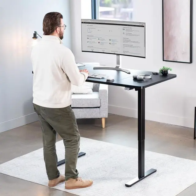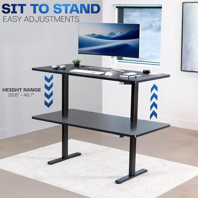 Transform your workstation to accommodate an active work life with the Black 60" x 30" Electric Desk (DESK-KIT-0B6B) from VIVO! Finding a healthy balance between sitting and standing throughout the long work day is made possible with electric height adjustment, telescopic legs, and a simple 2-button control panel. The spacious table top provides room for dual monitor setups and important supplies so you can organize your workspace to fit your preferred layout. With a frame constructed of solid steel, this desk supports up to 154 lbs and is built to last. All hardware and instructions are provided, so you can get your new workstation assembled and taking you to new heights!