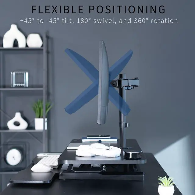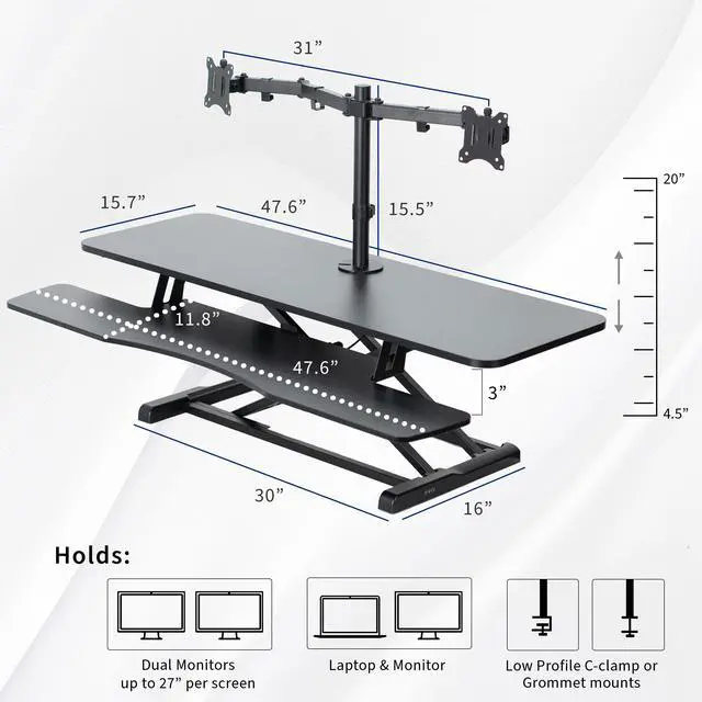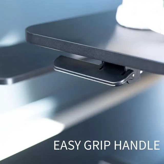 Create your own active workstation with the Black 48" Desk Riser with Dual Monitor Mount (DESK-V048KB-M2) from VIVO! Transitioning between sitting and standing throughout the long work day provides numerous benefits for the body such as increased blood flow and reduced tension. This solidly built desk riser allows you to make height transitions at the squeeze of a handle, and the dual monitor stand attaches to your riser via the sturdy grommet mount for additional height adjustment options and comfortable viewing angles. All hardware and instructions are provided so you can get your new desk riser and monitor stand assembled in no time!