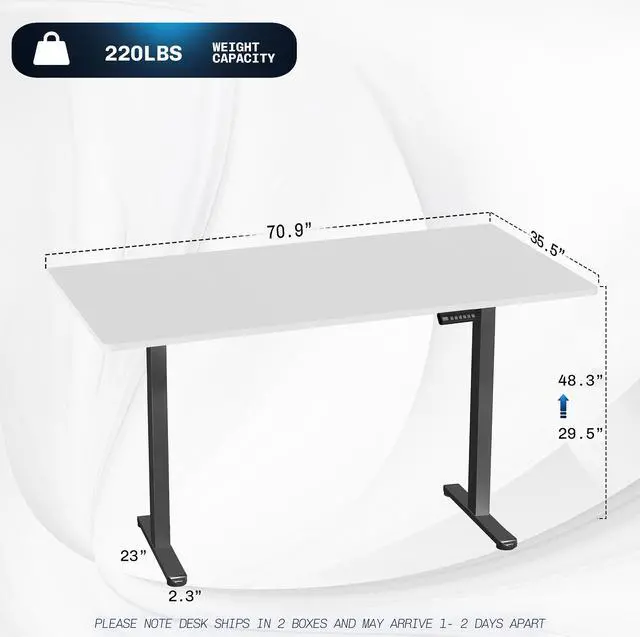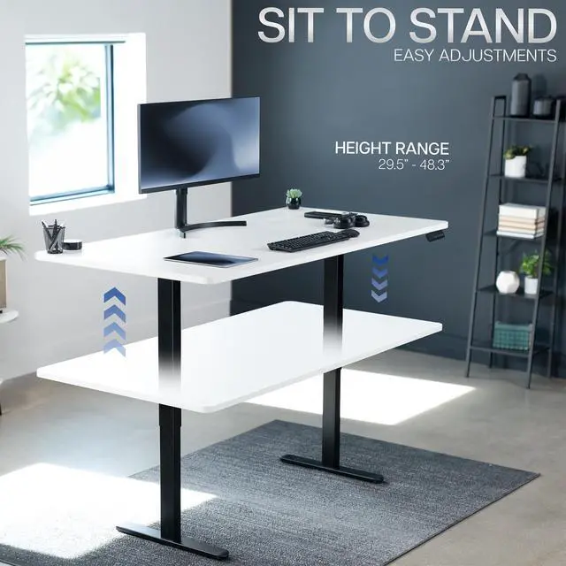 Transform your workstation to accommodate an active work life with the White / Black 71" x 36" Dual Motor Electric Desk (DESK-KIT-E2B7W-36) from VIVO! Finding a healthy balance between sitting and standing throughout the long work day is made possible with electric height adjustment, telescopic legs, and a push-button control panel featuring 3 memory presets. The spacious, extra-deep table top provides room for multi-monitor setups and important supplies so you can organize your workspace to fit your preferred layout. With a frame constructed of solid steel, this desk supports up to 220 lbs and is built to last. All hardware and instructions are provided, so you can get your new workstation assembled and taking you to new heights!