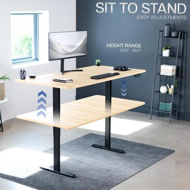 Transform your workstation to accommodate an active work life with the Light Wood / Black 71" x 36" Dual Motor Electric Desk (DESK-KIT-E2B7C-36) from VIVO! Finding a healthy balance between sitting and standing throughout the long work day is made possible with electric height adjustment, telescopic legs, and a push-button control panel featuring 3 memory presets. The spacious, extra-deep table top provides room for multi-monitor setups and important supplies so you can organize your workspace to fit your preferred layout. With a frame constructed of solid steel, this desk supports up to 220 lbs and is built to last. All hardware and instructions are provided, so you can get your new workstation assembled and taking you to new heights!