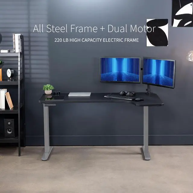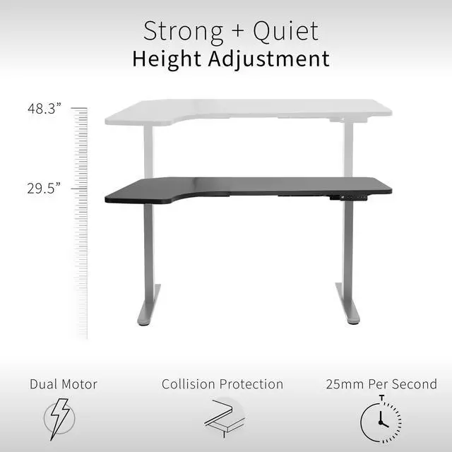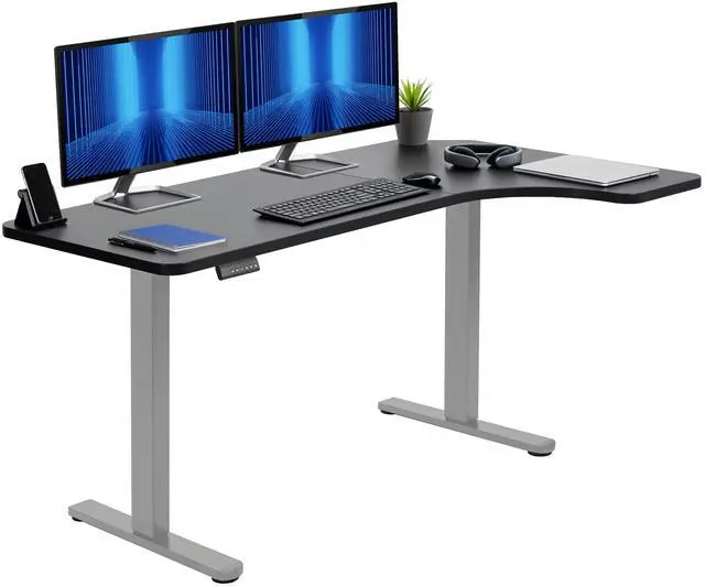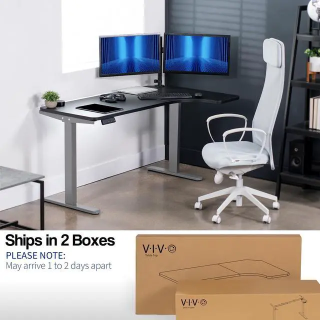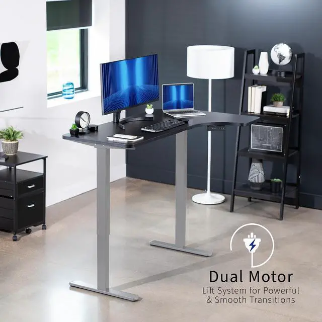 Transform your workstation to accommodate an active work life with the Black / Gray 58" x 35" Dual Motor Corner Electric Desk (DESK-KIT-E2GRB) from VIVO! Find a healthy balance between sitting and standing throughout the long work day with electric height adjustment, telescopic legs, and a simple push-button controller featuring 3 memory presets. The frame is constructed of solid steel for long-lasting use, supporting up to 220 lbs. The spacious curved table top provides room for multi-screen setups and important supplies, and all hardware is provided to get the top assembled and installed to the frame in no time!