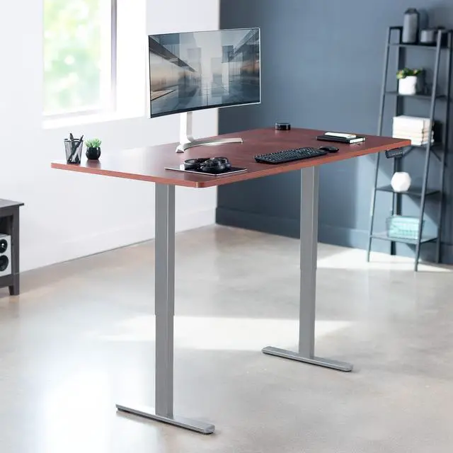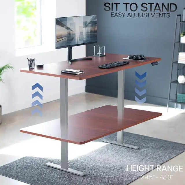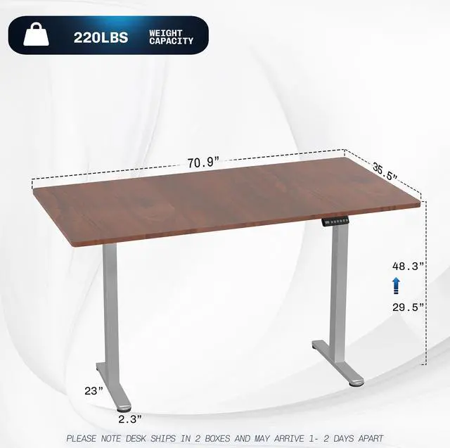 Transform your workstation to accommodate an active work life with the Dark Walnut / Gray 71" x 36" Dual Motor Electric Desk (DESK-KIT-E2G7D-36) from VIVO! Finding a healthy balance between sitting and standing throughout the long work day is made possible with electric height adjustment, telescopic legs, and a push-button control panel featuring 3 memory presets. The spacious, extra-deep table top provides room for multi-monitor setups and important supplies so you can organize your workspace to fit your preferred layout. With a frame constructed of solid steel, this desk supports up to 220 lbs and is built to last. All hardware and instructions are provided, so you can get your new workstation assembled and taking you to new heights!