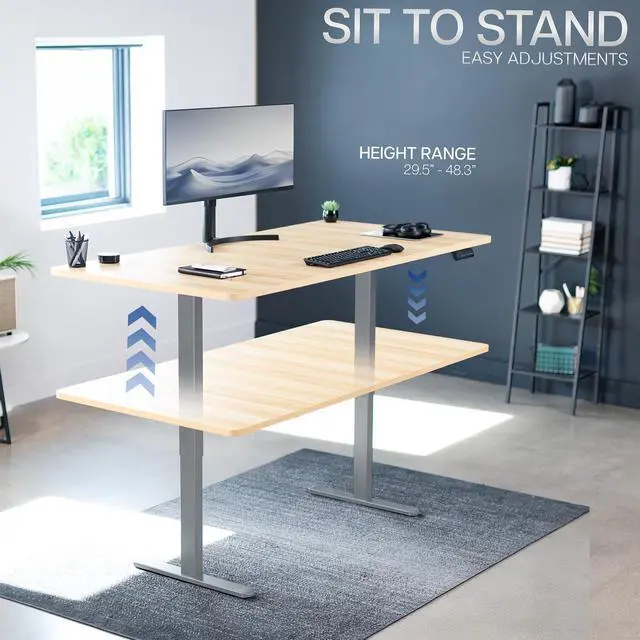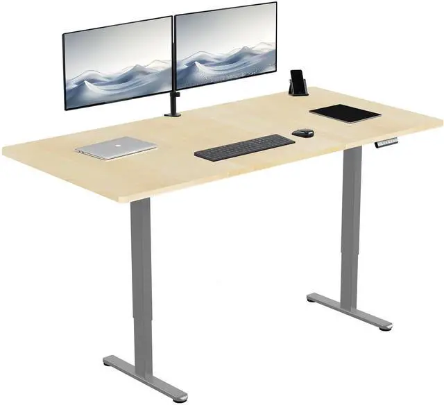 Transform your workstation to accommodate an active work life with the Light Wood / Gray 71" x 36" Dual Motor Electric Desk (DESK-KIT-E2G7C-36) from VIVO! Finding a healthy balance between sitting and standing throughout the long work day is made possible with electric height adjustment, telescopic legs, and a push-button control panel featuring 3 memory presets. The spacious, extra-deep table top provides room for multi-monitor setups and important supplies so you can organize your workspace to fit your preferred layout. With a frame constructed of solid steel, this desk supports up to 220 lbs and is built to last. All hardware and instructions are provided, so you can get your new workstation assembled and taking you to new heights!