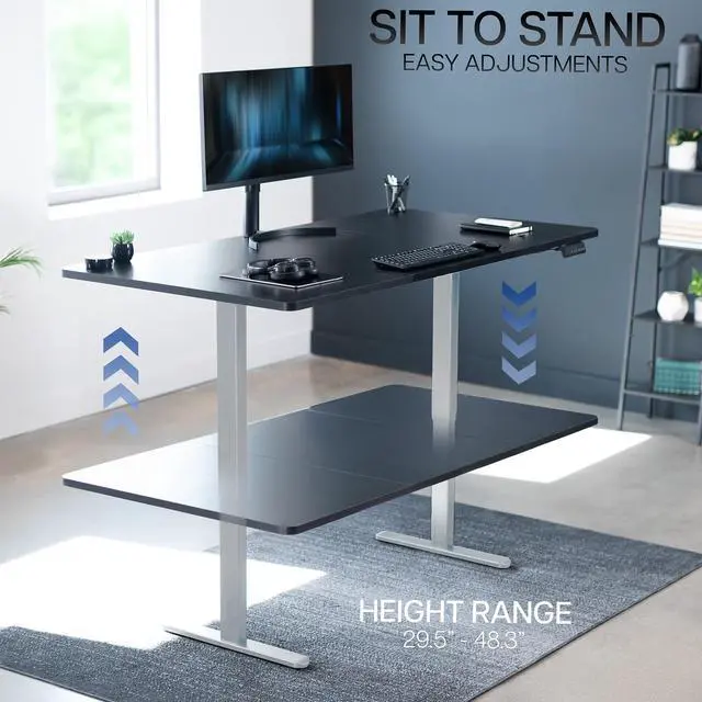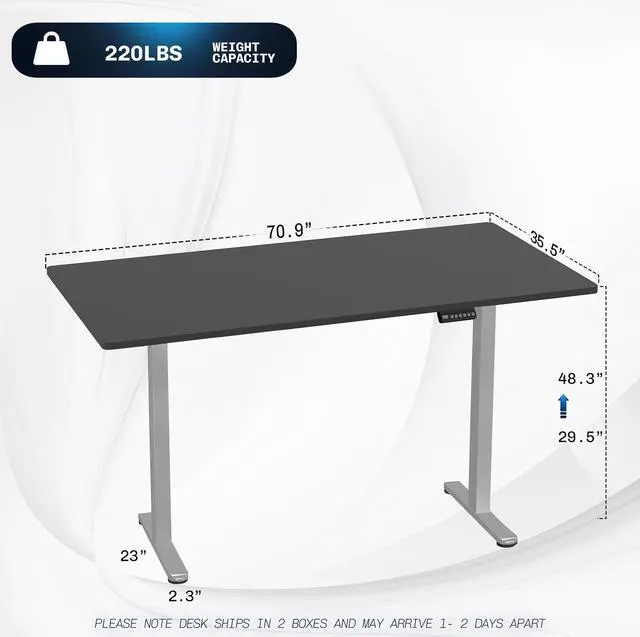 Transform your workstation to accommodate an active work life with the Black / Gray 71" x 36" Dual Motor Electric Desk (DESK-KIT-E2G7B-36) from VIVO! Finding a healthy balance between sitting and standing throughout the long work day is made possible with electric height adjustment, telescopic legs, and a push-button control panel featuring 3 memory presets. The spacious, extra-deep table top provides room for multi-monitor setups and important supplies so you can organize your workspace to fit your preferred layout. With a frame constructed of solid steel, this desk supports up to 220 lbs and is built to last. All hardware and instructions are provided, so you can get your new workstation assembled and taking you to new heights!