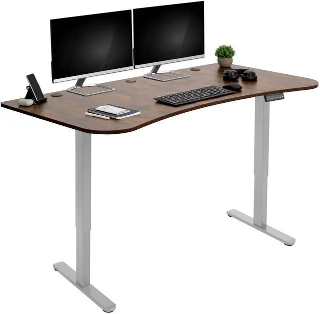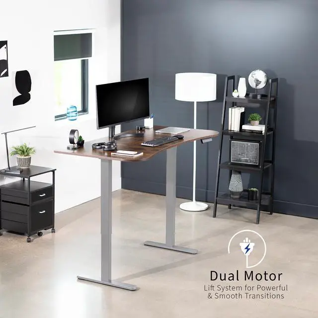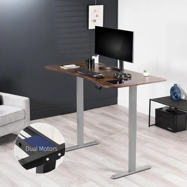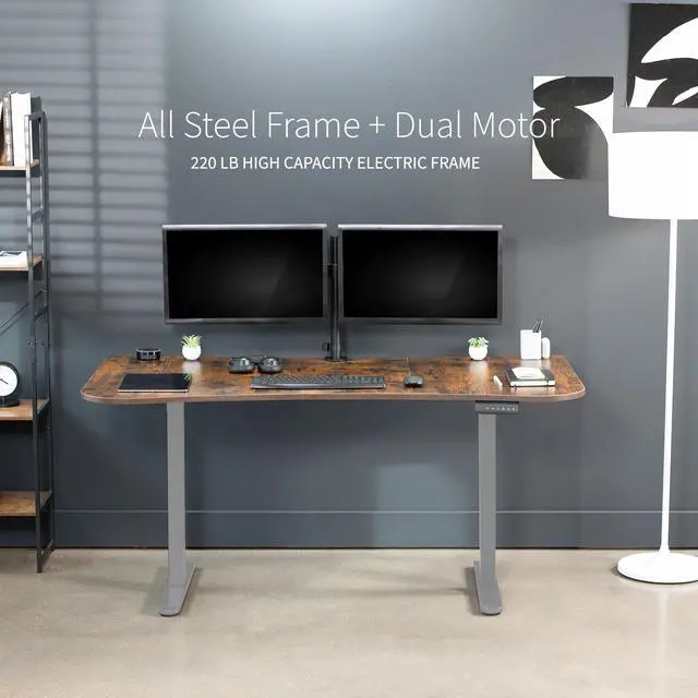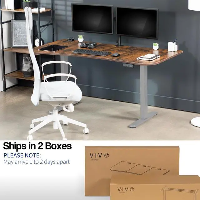 Transform your workstation to accommodate an active work life with the Vintage Brown / Gray 63" x 32" Dual Motor Electric Desk (DESK-KIT-E2G1N) from VIVO! Find that healthy balance between sitting and standing throughout the long work day with electric height adjustment, telescopic legs, and a simple push-button controller featuring 3 memory presets. With a frame constructed of solid steel, this desk supports up to 220 lbs and is built to last. The table top comes packaged in 3 sections, and all hardware is provided to get your desk frame put together and installed to your desktop in no time!