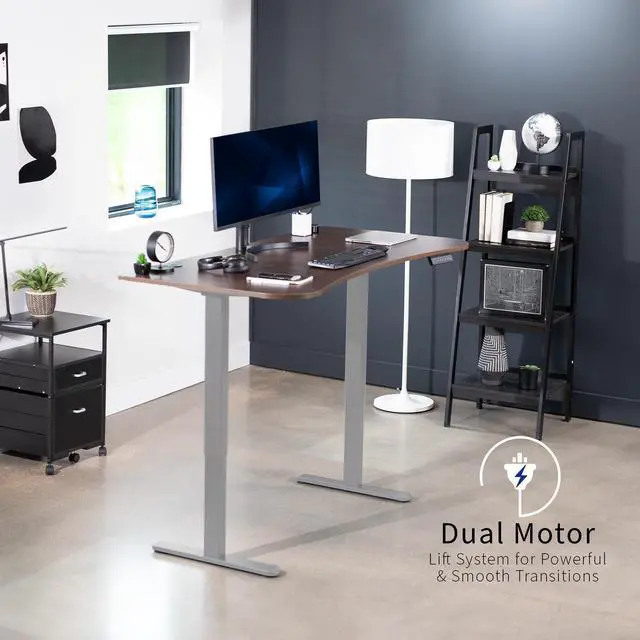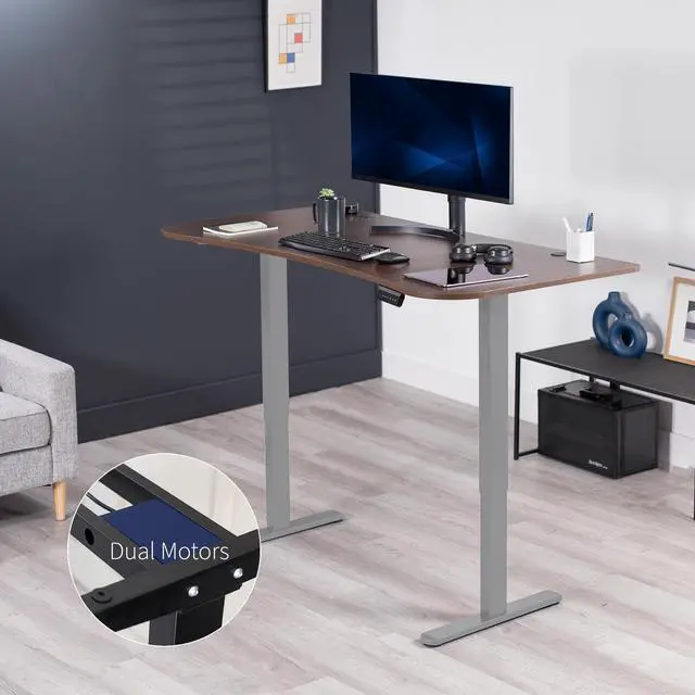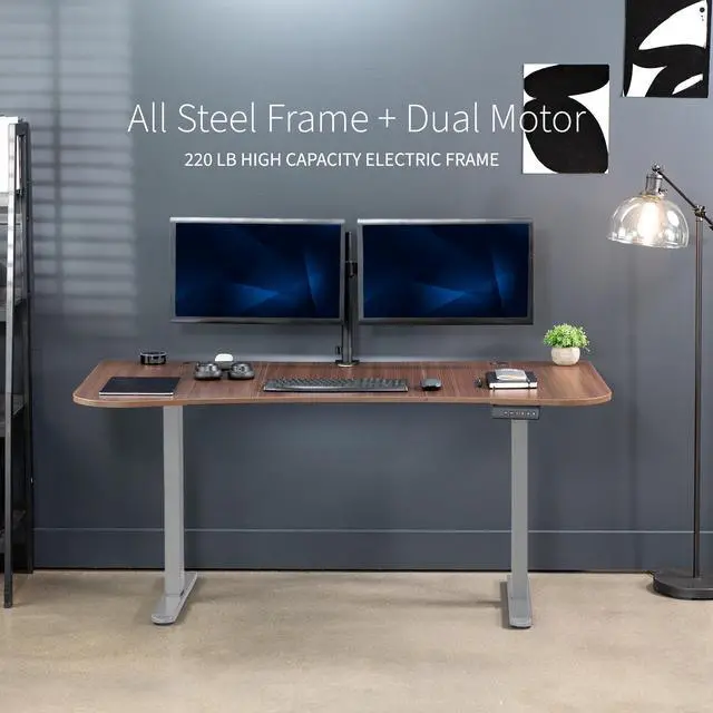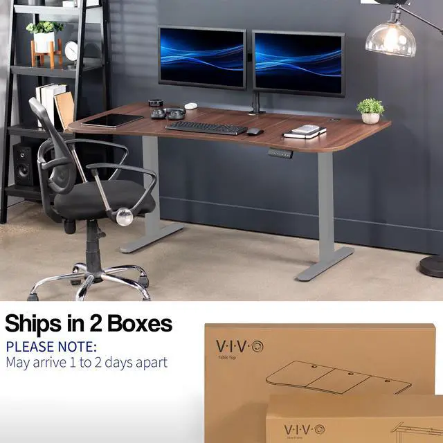 Transform your workstation to accommodate an active work life with the Dark Walnut / Gray 63" x 32" Dual Motor Electric Desk (DESK-KIT-E2G1D) from VIVO! Find that healthy balance between sitting and standing throughout the long work day with electric height adjustment, telescopic legs, and a simple push-button controller featuring 3 memory presets. With a frame constructed of solid steel, this desk supports up to 220 lbs and is built to last. The table top comes packaged in 3 sections, and all hardware is provided to get your desk frame put together and installed to your desktop in no time!