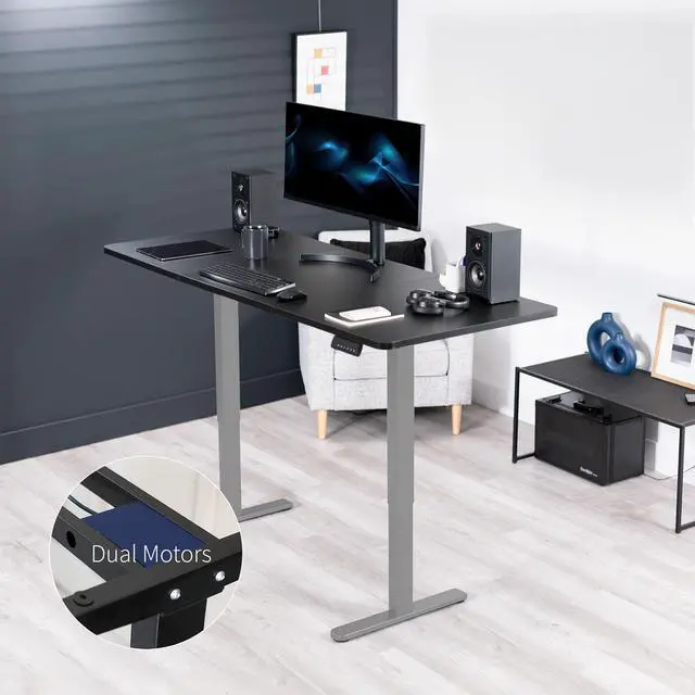 Transform your workstation to accommodate an active work life with the Black / Gray 71" x 30" Dual Motor Electric Desk (DESK-KIT-E2G7B) from VIVO! Finding a healthy balance between sitting and standing throughout the long work day is made possible with electric height adjustment, telescopic legs, and a push-button control panel featuring 3 memory presets. The spacious, extra-deep table top provides room for multi-monitor setups and important supplies so you can organize your workspace to fit your preferred layout. With a frame constructed of solid steel, this desk supports up to 220 lbs and is built to last. All hardware and instructions are provided, so you can get your new workstation assembled and taking you to new heights!