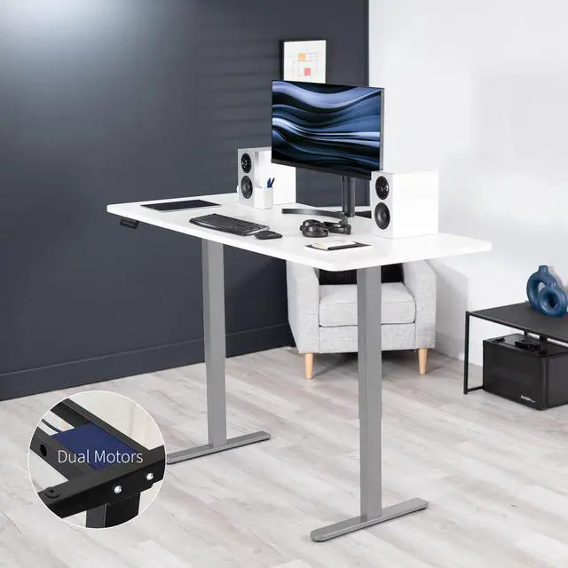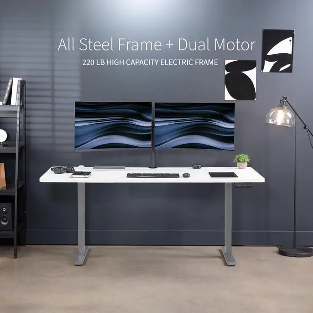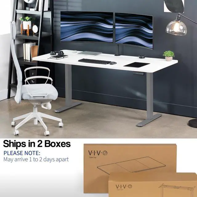Transform your workstation to accommodate an active work life with the White / Gray 71" x 30" Dual Motor Electric Desk (DESK-KIT-E2G7W) from VIVO! Finding a healthy balance between sitting and standing throughout the long work day is made possible with electric height adjustment, telescopic legs, and a push-button control panel featuring 3 memory presets. The spacious, extra-deep table top provides room for multi-monitor setups and important supplies so you can organize your workspace to fit your preferred layout. With a frame constructed of solid steel, this desk supports up to 220 lbs and is built to last. All hardware and instructions are provided, so you can get your new workstation assembled and taking you to new heights!