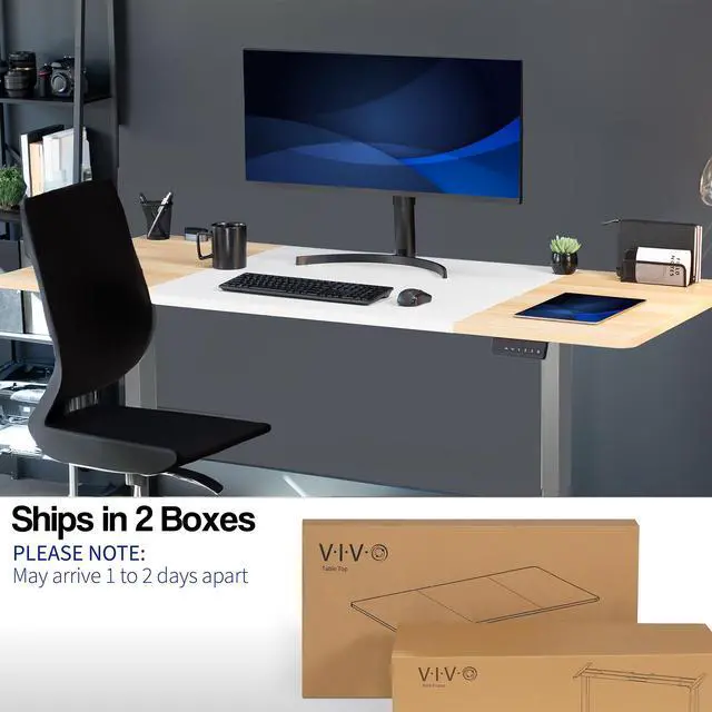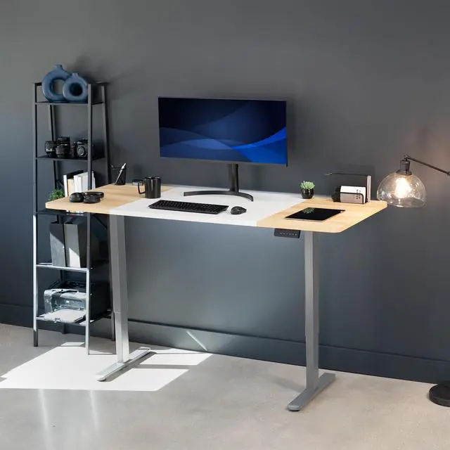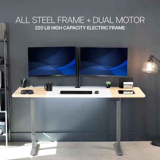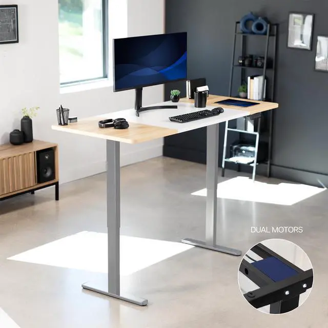 Transform your workstation to accommodate an active work life with the White & Light Wood / Gray 71" x 30" Dual Motor Electric Desk (DESK-KIT-E2G7WC) from VIVO! Finding a healthy balance between sitting and standing throughout the long work day is made possible with electric height adjustment, telescopic legs, and a push-button control panel featuring 3 memory presets. The spacious, extra-deep table top provides room for multi-monitor setups and important supplies so you can organize your workspace to fit your preferred layout. With a frame constructed of solid steel, this desk supports up to 220 lbs and is built to last. All hardware and instructions are provided, so you can get your new workstation assembled and taking you to new heights!