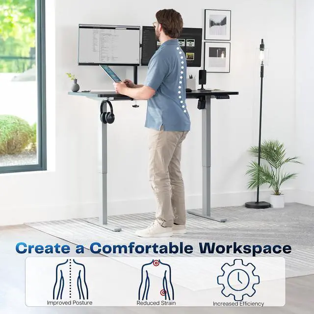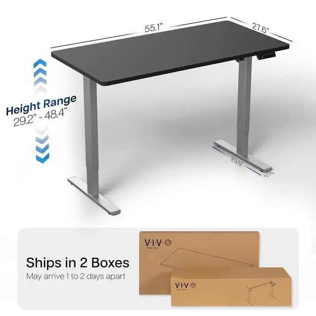 Transform your workstation to accommodate an active work life with the Black / Gray 55" x 28" Electric Desk (DESK-KIT-1G55B) from VIVO! Finding a healthy balance between sitting and standing throughout the long work day is made possible with electric height adjustment, telescopic legs, and a simple push-button controller featuring 4 memory presets. The large one-piece table top provides room for dual-monitor setups and important supplies so you can organize your workspace to fit your desired layout. With a frame constructed of solid steel, this desk supports up to 220 lbs and is built to last. All hardware and instructions are provided, so you can get your new workstation assembled and experience your very own standing desk in no time!