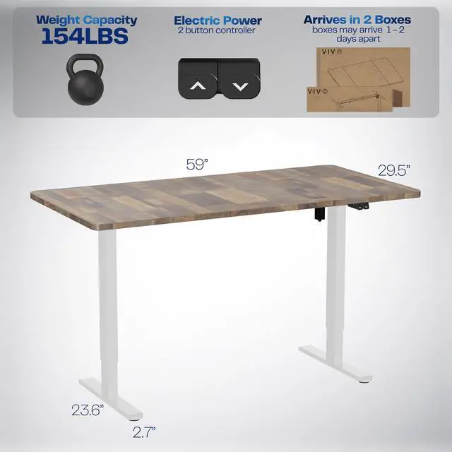 Transform your workstation to accommodate an active work life with the Reclaimed Wood / White 60" x 30" Electric Desk (DESK-KIT-0W6P) from VIVO! Finding a healthy balance between sitting and standing throughout the long work day is made possible with electric height adjustment, telescopic legs, and a simple 2-button control panel. The spacious table top provides room for dual monitor setups and important supplies so you can organize your workspace to fit your preferred layout. With a frame constructed of solid steel, this desk supports up to 154 lbs and is built to last. All hardware and instructions are provided, so you can get your new workstation assembled and taking you to new heights!