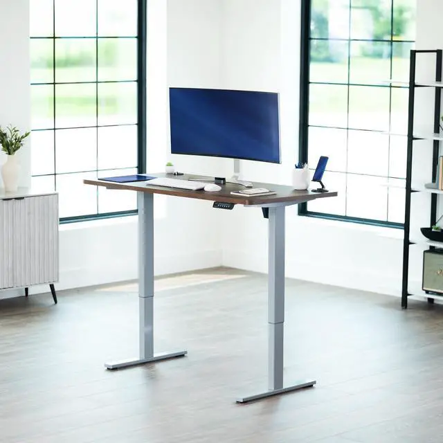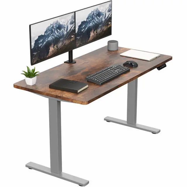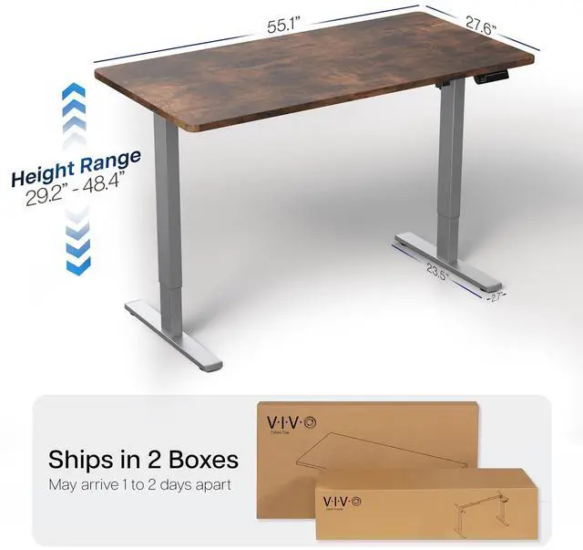 Transform your workstation to accommodate an active work life with the Vintage Brown / Gray 55" x 28" Electric Desk (DESK-KIT-1G55N) from VIVO! Finding a healthy balance between sitting and standing throughout the long work day is made possible with electric height adjustment, telescopic legs, and a simple push-button controller featuring 4 memory presets. The large one-piece table top provides room for dual-monitor setups and important supplies so you can organize your workspace to fit your desired layout. With a frame constructed of solid steel, this desk supports up to 220 lbs and is built to last. All hardware and instructions are provided, so you can get your new workstation assembled and experience your very own standing desk in no time!