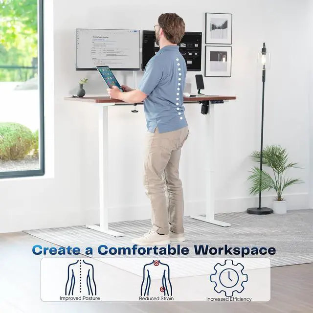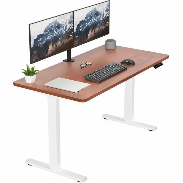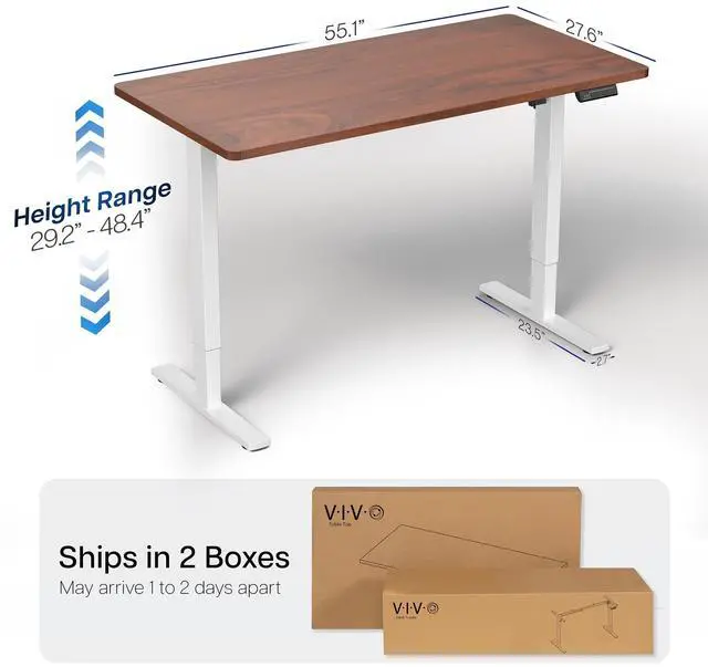 Transform your workstation to accommodate an active work life with the Dark Walnut / White 55" x 28" Electric Desk (DESK-KIT-1W55D) from VIVO! Finding a healthy balance between sitting and standing throughout the long work day is made possible with electric height adjustment, telescopic legs, and a simple push-button controller featuring 4 memory presets. The large one-piece table top provides room for dual-monitor setups and important supplies so you can organize your workspace to fit your desired layout. With a frame constructed of solid steel, this desk supports up to 220 lbs and is built to last. All hardware and instructions are provided, so you can get your new workstation assembled and experience your very own standing desk in no time!