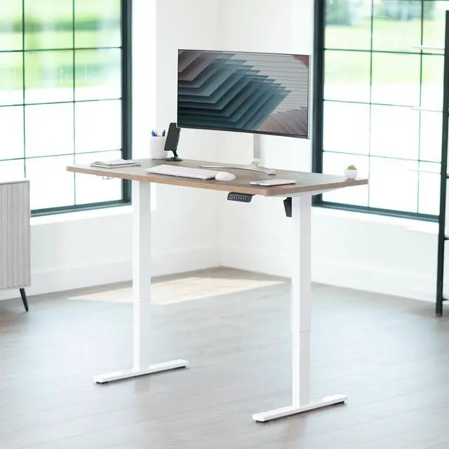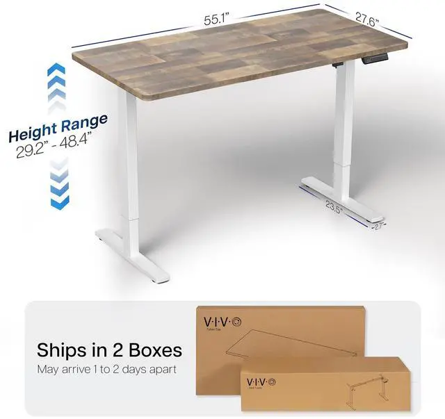 Transform your workstation to accommodate an active work life with the Reclaimed Wood / White 55" x 28" Electric Desk (DESK-KIT-1W55P) from VIVO! Finding a healthy balance between sitting and standing throughout the long work day is made possible with electric height adjustment, telescopic legs, and a simple push-button controller featuring 4 memory presets. The large one-piece table top provides room for dual-monitor setups and important supplies so you can organize your workspace to fit your desired layout. With a frame constructed of solid steel, this desk supports up to 220 lbs and is built to last. All hardware and instructions are provided, so you can get your new workstation assembled and experience your very own standing desk in no time!