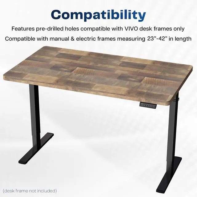 Find the perfect space efficient table top solution for your standing desk frame with the Reclaimed Wood 43" x 24" Table Top (DESK-TOP43P) from VIVO! Featuring solid particle board in a reclaimed wood pattern, this product provides the finishing touch to your adjustable workstation. Go from sitting to standing with all of your equipment and accessories safely resting on this sturdy surface. Compatible with both manual and electric frames measuring 23 to 42 in length, this table top gives you options! Whether you're creating your very first sit-to-stand workstation or you need a replacement part, this desk surface was built to last! All of the necessary instructions are provided to get your new platform attached to your current desk frame in no time!
