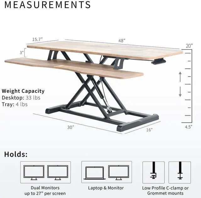 Enhance your work experience with the Reclaimed Wood 48 Desk Riser (DESK-V048KP) from VIVO! Transitioning between sitting and standing throughout the long work day provides numerous benefits such as increased blood flow and reduced tension. The solidly built desktop supports up to 33 lbs, easily holding multiple monitors or laptop and monitor combinations. It also features pneumatic spring lift that allows simple and smooth height adjustment at the squeeze of a handle. The dual-tiered design lets you customize your work area to create the workflow you need, and the keyboard tray is removable using the provided hex tool. All hardware and instructions are provided so you can get your new desk riser assembled in no time!