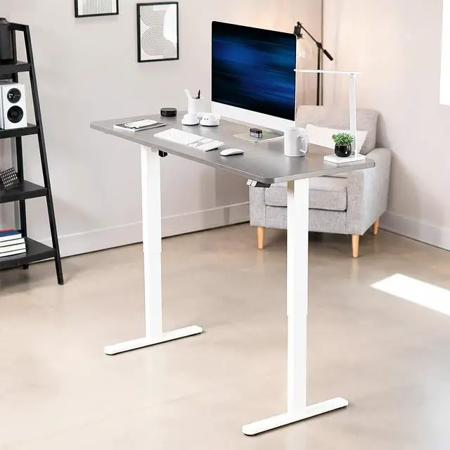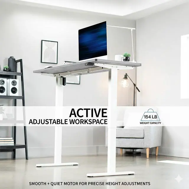 Transform your workstation to accommodate an active work life with the Dark Gray / White 60" x 24" Electric Desk (DESK-KIT-W06G) from VIVO! Finding a healthy balance between sitting and standing throughout the long work day is made possible with electric height adjustment, telescopic legs, and a simple 2-button control panel. The spacious table top provides room for dual monitor setups and important supplies so you can organize your workspace to fit your preferred layout. With a frame constructed of solid steel, this desk easily supports up to 154 lbs and is built to last. The integrated cable management system ensures that cords and cables are neatly organized and hidden from view for a tidy workspace that encourages concentration. All hardware and instructions are provided, so you can get your new workstation assembled and taking you to new heights!