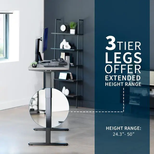Transform your workstation to accommodate an active work life with the Dark Gray / Black 60" x 24" Dual Motor Electric Desk (DESK-KIT-2B6G) from VIVO! Finding a healthy balance between sitting and standing throughout the long work day is made possible with electric height adjustment, telescopic legs, and a simple push-button controller featuring 3 memory presets. The spacious table top provides room for dual monitor setups and important supplies so you can organize your workspace to fit your preferred layout. With a frame constructed of solid steel, this desk supports up to 220 lbs and is built to last. All hardware and instructions are provided, so you can get your new workstation assembled and taking you to new heights!