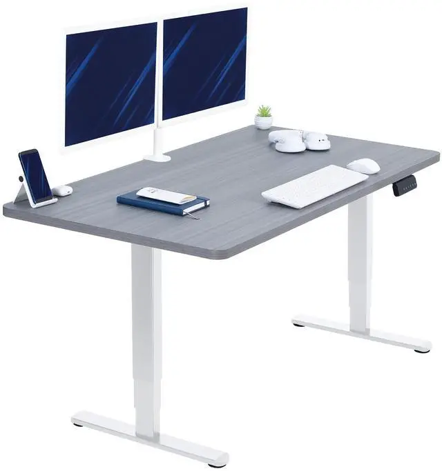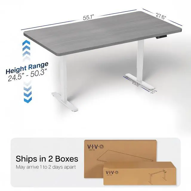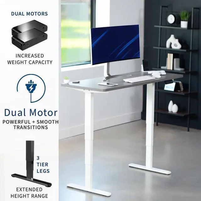 Transform your workstation to accommodate an active work life with the Dark Gray /White 55" x 28" Dual Motor Electric Desk (DESK-KIT-2W55G) from VIVO! Finding a healthy balance between sitting and standing throughout the long work day is made possible with electric height adjustment, telescopic legs, and a simple push-button controller featuring 3 memory presets. The spacious table top provides room for dual monitor setups and important supplies so you can organize your workspace to fit your preferred layout. With a frame constructed of solid steel, this desk supports up to 220 lbs and is built to last. All hardware and instructions are provided, so you can get your new workstation assembled and taking you to new heights!