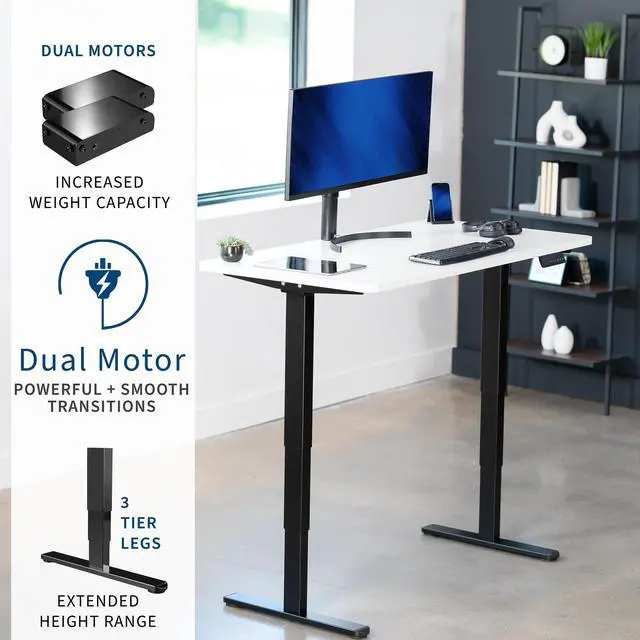 Transform your workstation to accommodate an active work life with the White / Black 60" x 24" Dual Motor Electric Desk (DESK-KIT-2B6W) from VIVO! Finding a healthy balance between sitting and standing throughout the long work day is made possible with electric height adjustment, telescopic legs, and a simple push-button controller featuring 3 memory presets. The spacious table top provides room for dual monitor setups and important supplies so you can organize your workspace to fit your preferred layout. With a frame constructed of solid steel, this desk supports up to 220 lbs and is built to last. All hardware and instructions are provided, so you can get your new workstation assembled and taking you to new heights!