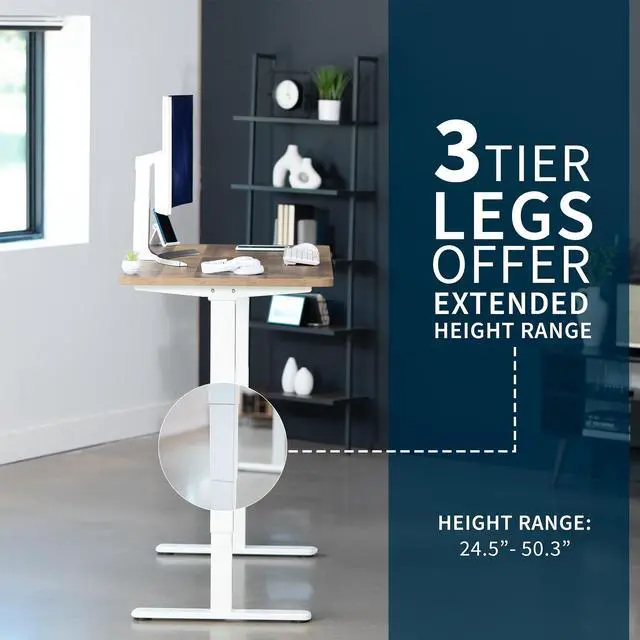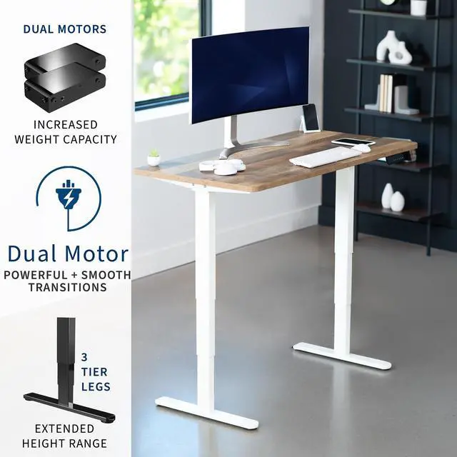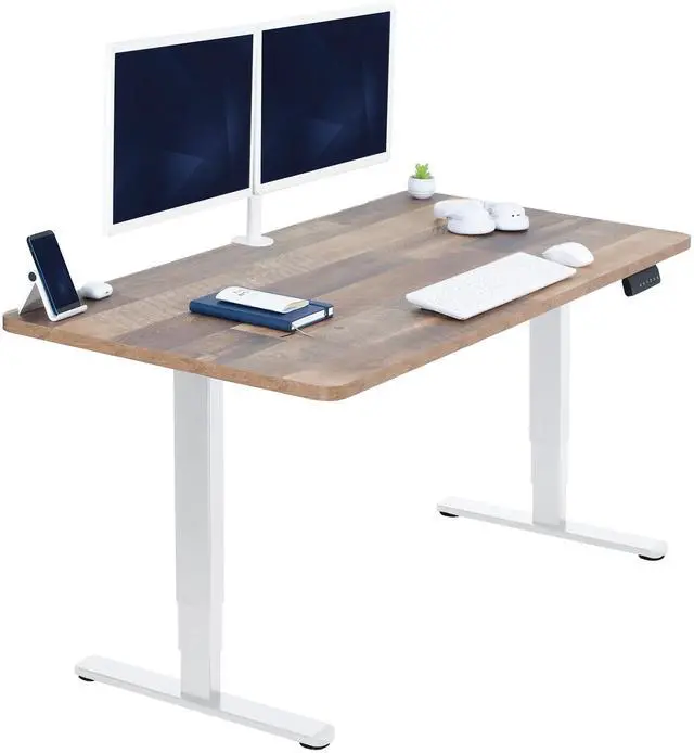 Transform your workstation to accommodate an active work life with the Reclaimed Wood /White 55" x 28" Dual Motor Electric Desk (DESK-KIT-2W55P) from VIVO! Finding a healthy balance between sitting and standing throughout the long work day is made possible with electric height adjustment, telescopic legs, and a simple push-button controller featuring 3 memory presets. The spacious table top provides room for dual monitor setups and important supplies so you can organize your workspace to fit your preferred layout. With a frame constructed of solid steel, this desk supports up to 220 lbs and is built to last. All hardware and instructions are provided, so you can get your new workstation assembled and taking you to new heights!