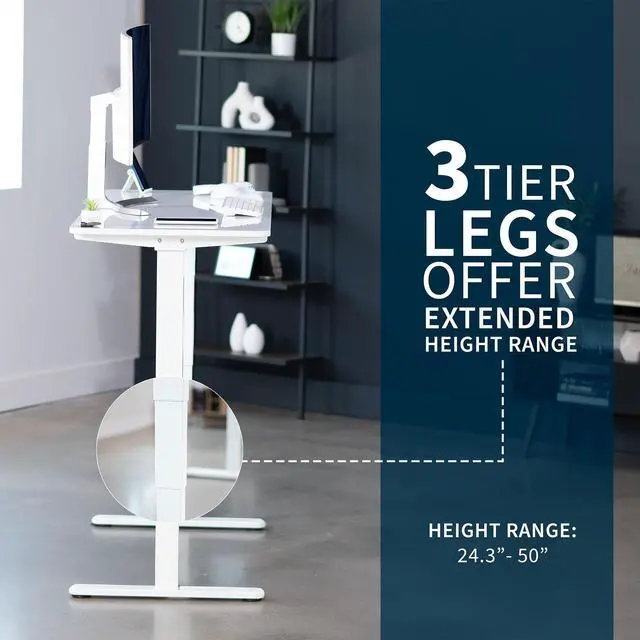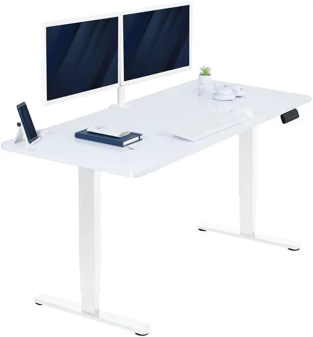 Transform your workstation to accommodate an active work life with the White Dry Erase 60" x 24" Dual Motor Electric Desk (DESK-KIT-2W6WE) from VIVO! Finding a healthy balance between sitting and standing throughout the long work day is made possible with electric height adjustment, telescopic legs, and a simple push-button controller featuring 3 memory presets. The spacious table top provides a sleek writing surface across the entire top, giving you plenty of space to sketch out ideas or take notes. With a frame constructed of solid steel, this desk supports up to 220 lbs and is built to last. All hardware and instructions are provided, so you can get your new workstation assembled and taking you to new heights!