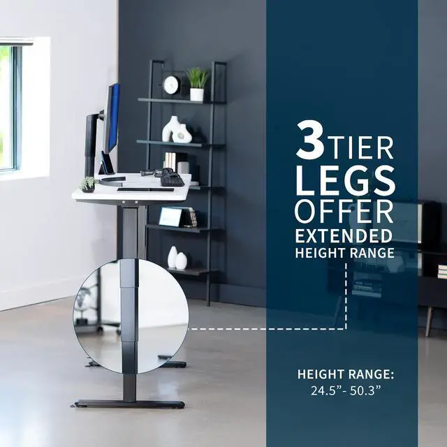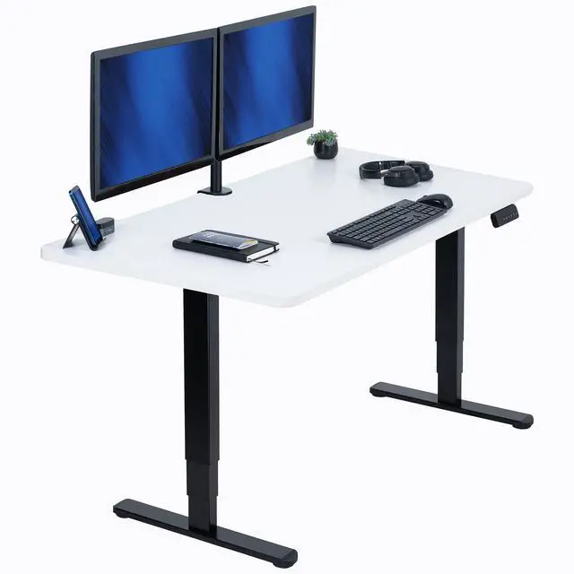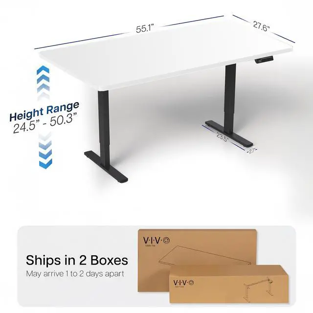 Transform your workstation to accommodate an active work life with the White /Black 55" x 28" Dual Motor Electric Desk (DESK-KIT-2B55W) from VIVO! Finding a healthy balance between sitting and standing throughout the long work day is made possible with electric height adjustment, telescopic legs, and a simple push-button controller featuring 3 memory presets. The spacious table top provides room for dual monitor setups and important supplies so you can organize your workspace to fit your preferred layout. With a frame constructed of solid steel, this desk supports up to 220 lbs and is built to last. All hardware and instructions are provided, so you can get your new workstation assembled and taking you to new heights!
