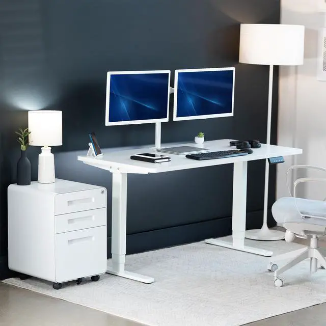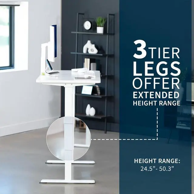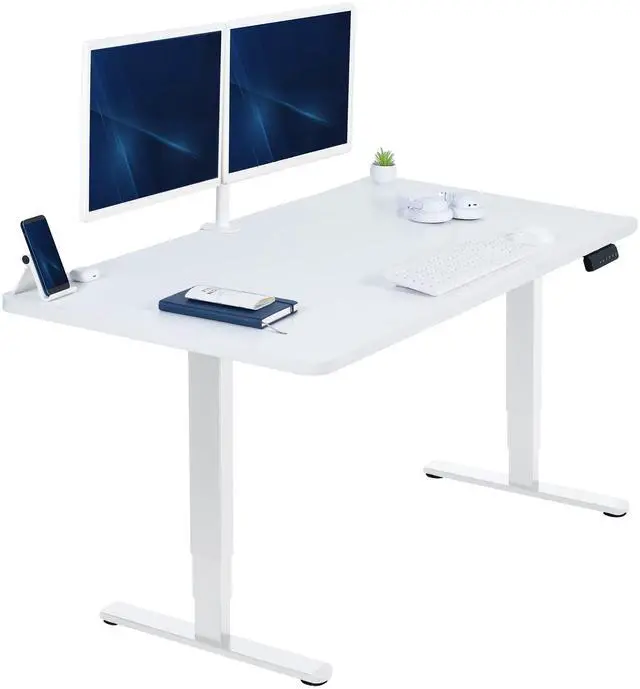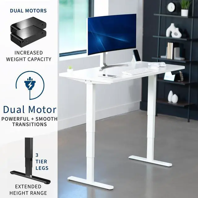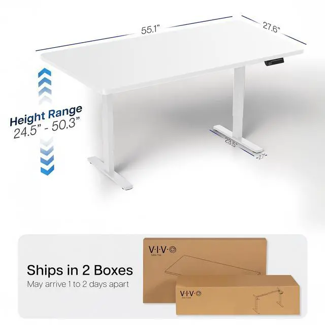 Transform your workstation to accommodate an active work life with theWhite 55" x 28" Dual Motor Electric Desk (DESK-KIT-2W55W) from VIVO! Finding a healthy balance between sitting and standing throughout the long work day is made possible with electric height adjustment, telescopic legs, and a simple push-button controller featuring 3 memory presets. The spacious table top provides room for dual monitor setups and important supplies so you can organize your workspace to fit your preferred layout. With a frame constructed of solid steel, this desk supports up to 220 lbs and is built to last. All hardware and instructions are provided, so you can get your new workstation assembled and taking you to new heights!