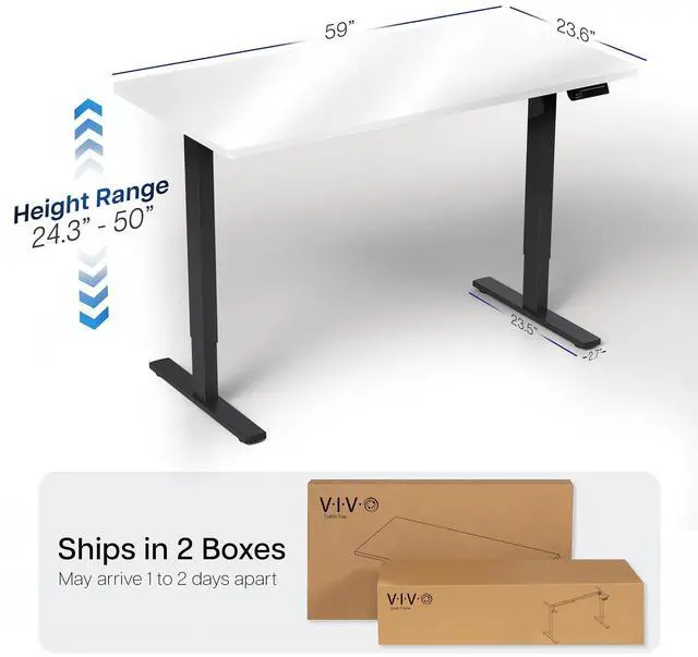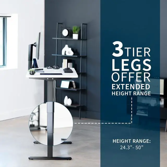 Transform your workstation to accommodate an active work life with the White Dry Erase / Black 60" x 24" Dual Motor Electric Desk (DESK-KIT-2B6WE) from VIVO! Finding a healthy balance between sitting and standing throughout the long work day is made possible with electric height adjustment, telescopic legs, and a simple push-button controller featuring 3 memory presets. The spacious table top provides a sleek writing surface across the entire top, giving you plenty of space to sketch out ideas or take notes. With a frame constructed of solid steel, this desk supports up to 220 lbs and is built to last. All hardware and instructions are provided, so you can get your new workstation assembled and taking you to new heights!