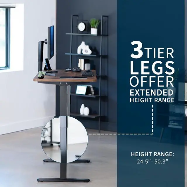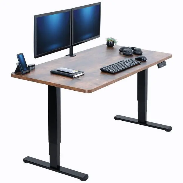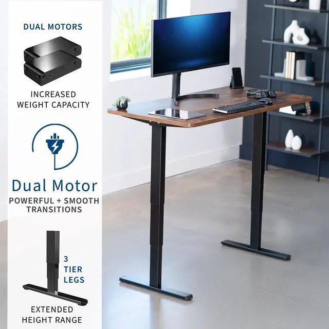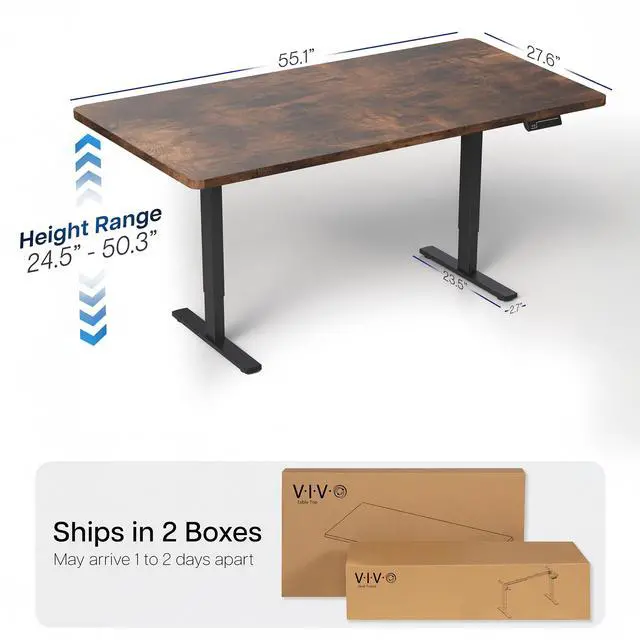 Transform your workstation to accommodate an active work life with the Vintage Brown /Black 55" x 28" Dual Motor Electric Desk (DESK-KIT-2B55N) from VIVO! Finding a healthy balance between sitting and standing throughout the long work day is made possible with electric height adjustment, telescopic legs, and a simple push-button controller featuring 3 memory presets. The spacious table top provides room for dual monitor setups and important supplies so you can organize your workspace to fit your preferred layout. With a frame constructed of solid steel, this desk supports up to 220 lbs and is built to last. All hardware and instructions are provided, so you can get your new workstation assembled and taking you to new heights!
