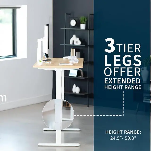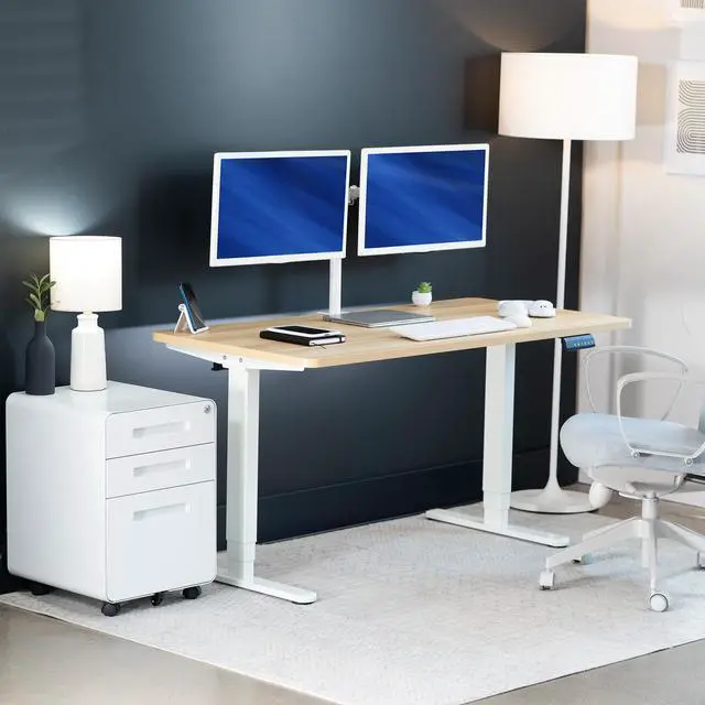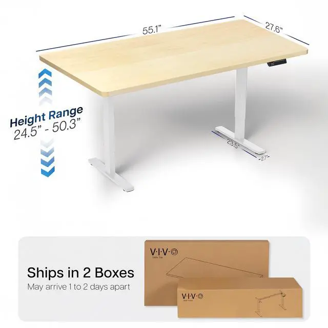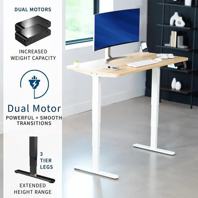 Transform your workstation to accommodate an active work life with the Light Wood /White 55" x 28" Dual Motor Electric Desk (DESK-KIT-2W55C) from VIVO! Finding a healthy balance between sitting and standing throughout the long work day is made possible with electric height adjustment, telescopic legs, and a simple push-button controller featuring 3 memory presets. The spacious table top provides room for dual monitor setups and important supplies so you can organize your workspace to fit your preferred layout. With a frame constructed of solid steel, this desk supports up to 220 lbs and is built to last. All hardware and instructions are provided, so you can get your new workstation assembled and taking you to new heights!