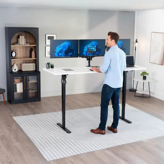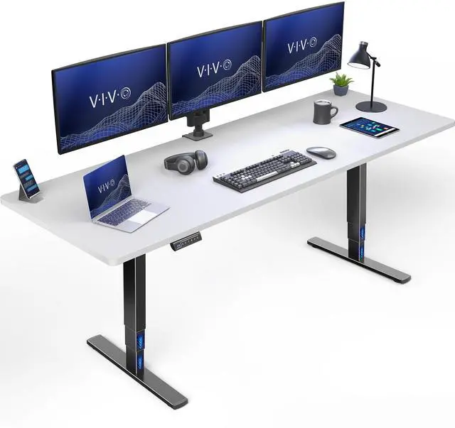 Transform your workstation to accommodate an active work life with the White / Black 83" x 30" Electric Desk (DESK-KIT-2E84W) from VIVO! Finding a healthy balance between sitting and standing throughout the long work day is made possible with electric height adjustment, 3-stage telescopic legs, and an elegant touch-screen control panel. The spacious table top provides room for dual-monitor setups and important supplies so you can organize your workspace to fit your preferred layout. With a frame constructed of solid steel, this desk supports up to 220 lbs and is built to last. The integrated cable management system ensures that cords and cables are neatly organized and hidden from view for a tidy workspace. All hardware and instructions are provided, so you can get your new workstation assembled and taking you to new heights!