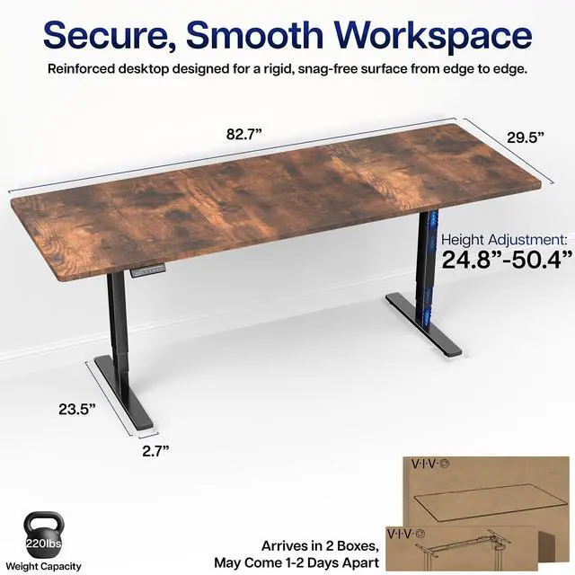 Transform your workstation to accommodate an active work life with the Vintage Brown / Black 83" x 30" Electric Desk (DESK-KIT-2E84N) from VIVO! Finding a healthy balance between sitting and standing throughout the long work day is made possible with electric height adjustment, 3-stage telescopic legs, and an elegant touch-screen control panel. The spacious table top provides room for dual-monitor setups and important supplies so you can organize your workspace to fit your preferred layout. With a frame constructed of solid steel, this desk supports up to 220 lbs and is built to last. The integrated cable management system ensures that cords and cables are neatly organized and hidden from view for a tidy workspace. All hardware and instructions are provided, so you can get your new workstation assembled and taking you to new heights!