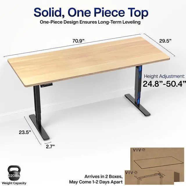 Transform your workstation to accommodate an active work life with the Light Wood / Black 71" x 30" Electric Desk (DESK-KIT-2E71C) from VIVO! Finding a healthy balance between sitting and standing throughout the long work day is made possible with electric height adjustment, 3-stage telescopic legs, and an elegant touch-screen control panel. The spacious, solid table top provides room for dual-monitor setups and important supplies so you can organize your workspace to fit your preferred layout. With a frame constructed of solid steel, this desk supports up to 220 lbs and is built to last. The integrated cable management system ensures that cords and cables are neatly organized and hidden from view for a tidy workspace. All hardware and instructions are provided, so you can get your new workstation assembled and taking you to new heights!