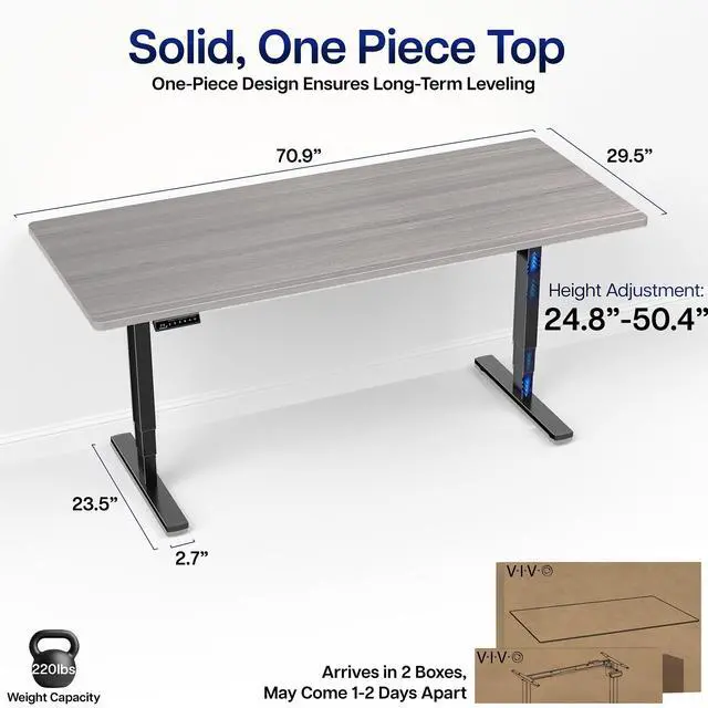 Transform your workstation to accommodate an active work life with the Dark Gray / Black 71" x 30" Electric Desk (DESK-KIT-2E71G) from VIVO! Finding a healthy balance between sitting and standing throughout the long work day is made possible with electric height adjustment, 3-stage telescopic legs, and an elegant touch-screen control panel. The spacious, solid table top provides room for dual-monitor setups and important supplies so you can organize your workspace to fit your preferred layout. With a frame constructed of solid steel, this desk supports up to 220 lbs and is built to last. The integrated cable management system ensures that cords and cables are neatly organized and hidden from view for a tidy workspace. All hardware and instructions are provided, so you can get your new workstation assembled and taking you to new heights!