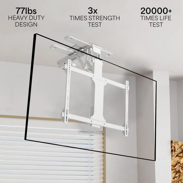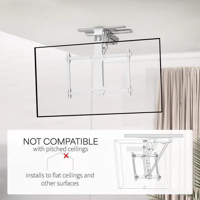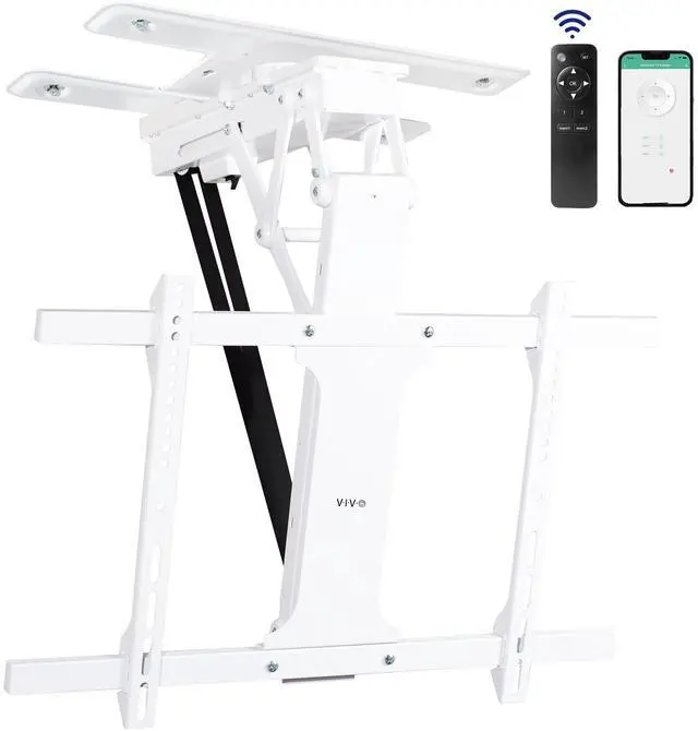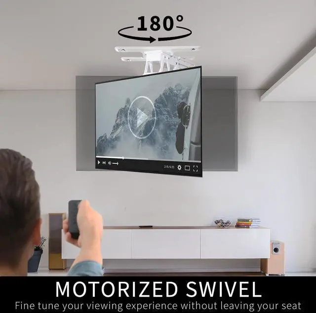 Enhance your visual display with the White Electric Flip Down / Swivel Ceiling TV Mount (MOUNT-E-FD70S-W) from VIVO! This heavy-duty motorized large TV mount is the perfect space-saver that installs to flat ceilings and other surfaces. The motor is controlled with an included RF remote featuring programmable memory settings to save your favorite viewing angles. You can also connect to the Tuya app to access convenient controls right from your mobile device! The fold-up design fits flat surfaces allowing for easy storage, cleared-up space, and out-of-way safety. Features include solid steel construction for durability, motorized swivel and height adjustment for comfortable viewing angles, screen tilt for glare reduction, and a removable VESA plate for easy mounting.
