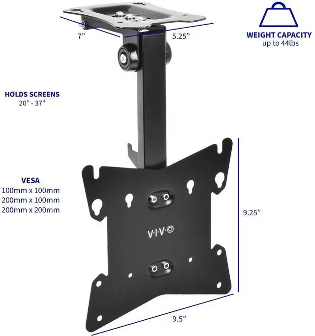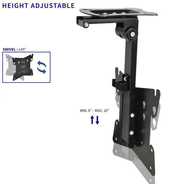 MOUNT-M-FD37B from VIVO, for LCD TV screens and monitors, is the perfect space saver that mounts to ceilings, cabinets (24" deep cabinets only), upper desk shelving, and more. The convenient fold-up design, tilting -90 degrees to 0 degrees, fits flat and pitched surfaces allowing for easy storage, cleared up space, and out-of-way safety. Load capacity is 44 lbs to ensure complete safety for your screen. Features include solid steel and aluminum construction, 90-degree swivel to allow for a variety of viewing angles, a removable VESA plate for easy mounting, and screen height adjustment using flexible sliding rails. The modern sleek design of the mount fits well into any home or office environment. This mount is designed to hold screens from 20" to 37" in size with compatible 100x100mm, 200x100mm, or 200x200mm mounting holes. Assembly is simple and we provide hardware to get your screen properly mounted.