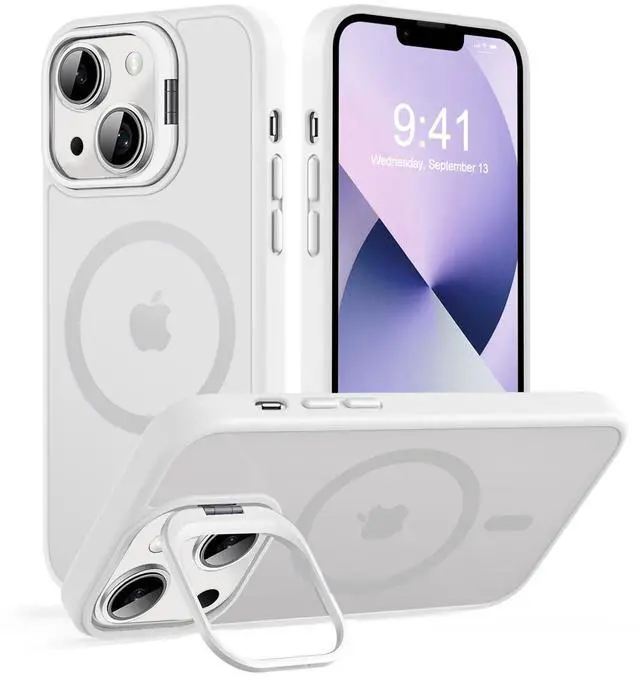Magnetic for iPhone 13 Case & iPhone 14 case, Compatible with Magsafe, Built-in Stash Stand, Matte Scratch-Resistant Back Cover Shockproof Phone Case for iPhone 13/ iPhone 14, Frosted White