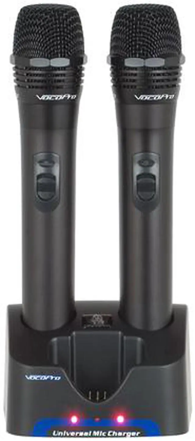 | Feature | 2 wireless rechargeable handheld mics included Included microphone charger charges both microphones at the same time UHF Band (600 MHz) Rugged mic grills protect the microphone cartridge and prevent the mic from rolling Individual Volume controls for precise vocal balancing Low battery indicator (LED) on mics Dual antennas provide clear signal reception Rugged 1 RU metal receiver chassis |