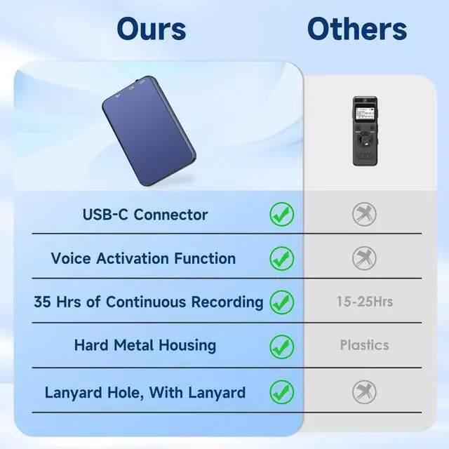 | Specifications | Size: 64GB, Brand: Vormooi, Color: blue, Format: wav, Battery_weight: 6 grams, Battery_average_life: 40 hours, Battery_cell_composition: lithium_ion, Skip_offer: false, Item_weight: 0.8 ounces, Part_number: Q1, Unspsc_code: 52161535, Manufacturer: Vormooi, Model_number: Q1, Num_batteries_type: a, Num_batteries_quantity: 1, Headphones_jack: 3.5 millimeters, Item_dimensions: 0.25 L x 1.3 W x 2.2 H inches, Lithium_battery_packaging: batteries_contained_in_equipment, Lithium_battery_energy_content: 1.11 watt_hours, Number_of_items: 1, Batteries_included: true, Batteries_required: true, Compatible_devices: Personal Computer, Hardware_interface: usb_c, Included_components_0: Voice Recorder*1, Included_components_1: User Manual*1, Included_components_2: Type-C Cable*1, Included_components_3: Lanyard*1, Included_components_4: Other accessories, Item_package_weight: 0.132 kilograms, Warranty_description: 2 years, Microphone_form_factor: Built-In, Item_depth_width_height_depth: 0.25 inches, Item_depth_width_height_width: 1.3 inches, Item_depth_width_height_height: 2.2 inches, Item_package_dimensions: 1.905 L x 13.4112 W x 13.4112 H centimeters, Memory_storage_capacity: 64 GB, Contains_battery_or_cell: battery, Product_site_launch_date: 2025-03-27T00:10:53.579Z, Microphone_operation_mode: Mono, Number_of_lithium_ion_cells: 1, Includes_rechargable_battery: true, Battery_installation_device_type: not_installed, Supplier_declared_dg_hz_regulation: storage, Has_multiple_battery_powered_components: true, Supplier_declared_has_product_identifier_exemption: true |