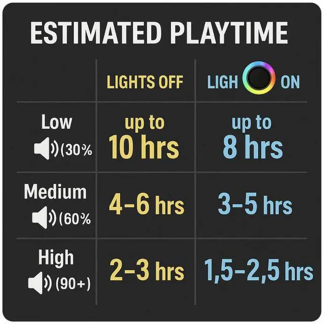 2200mAh battery provides up to 10 hours of playtime on a 2-hour charge.