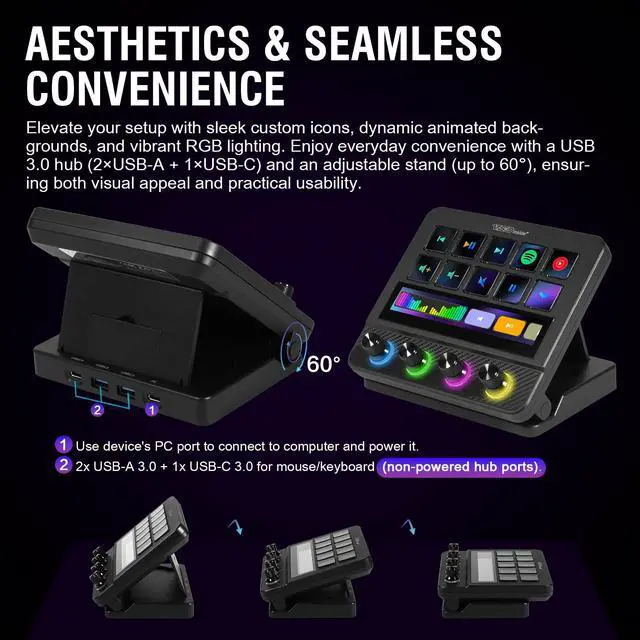 As VSDinside’s latest stream dock model, it introduces an array of enhanced practical features. An adjustable stand lets you fine-tune viewing angles for optimal comfort, while a carbon-fiber-like overlay elevates its premium aesthetic. Complementing this are toggleable key haptics for tactile feedback control, plus a 2× USB 3.0 + 1× USB-C non-powered hub to expand connectivity(compatible with mice, keyboards, USB flash drives, and more) - seamlessly merging sleek design with everyday functionality.