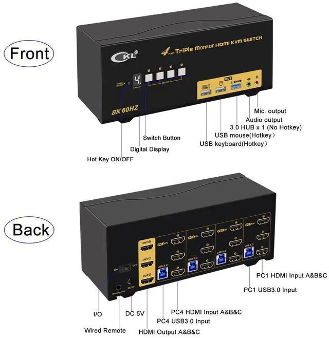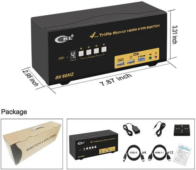 4x3 KVM SWITCH HDMI 8K 60HZ 4K 144HZ : Newest HDMI 2.1 technology to achieve max. Resolution of 7680*4320@30/60Hz, 5120*2880/1440@50/60Hz, 3840*2160@144hz, 3440*1440@144Hz, 3840*1080@240hz, 2560*1440@144hz, ideal for high resolution needs and gaming without delay. Supports EDID emulation to maintain correct display.