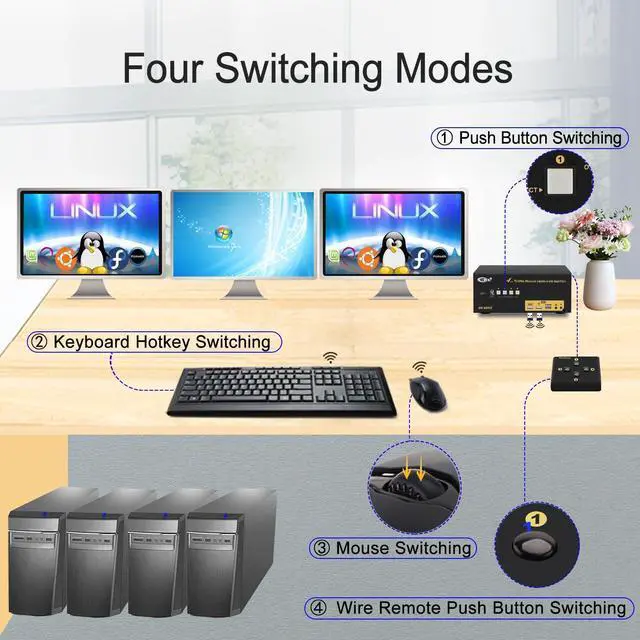 NOT MANY KVM SWITCHES HAVE 5 SWITCHING MODES: It supports multiple switching modes using keyboard hotkey, mouse roller clicks, push button and wired remote, as well as auto scan with adjustable interval between 8 - 999 seconds for testing and Surveillance purpose.