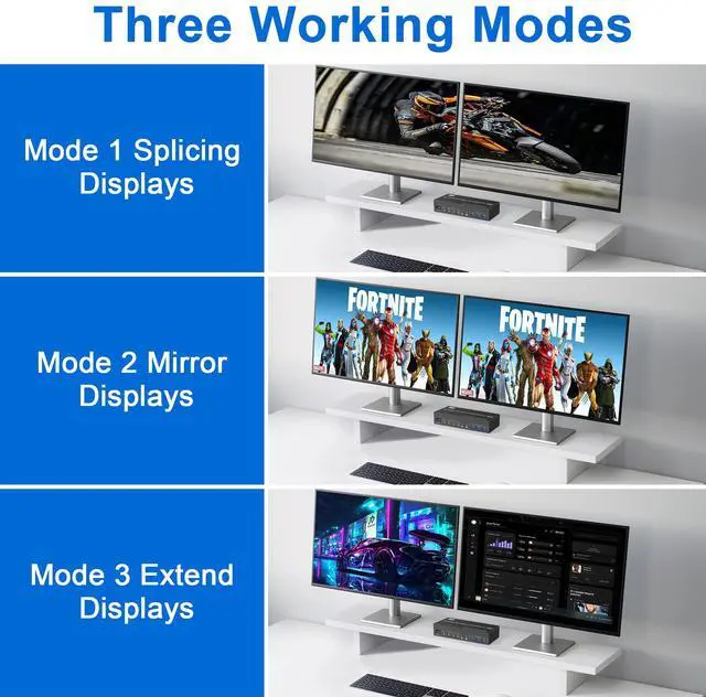 2. Support HDMI 2.1 and DP 1.4 standards and downward compatible. 3 monitors output support up to 8K@60Hz for extended,mirrored or spliced displayDepends on your computer's graphics card.;