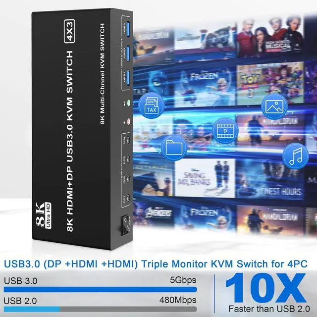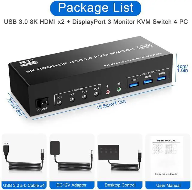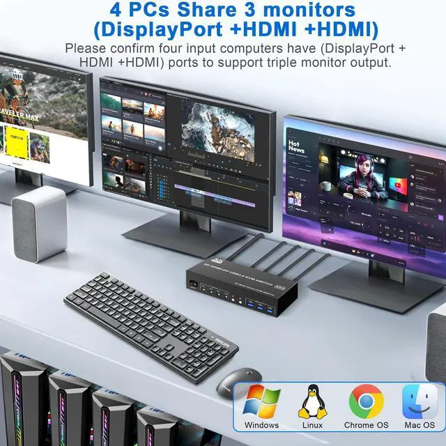1. 8K Triple Monitor KVM Switch 4-Port allows 4 computers/laptops share one set of keyboard, mouse, and 3 monitors (2 HDMI + 1 DisplayPort)